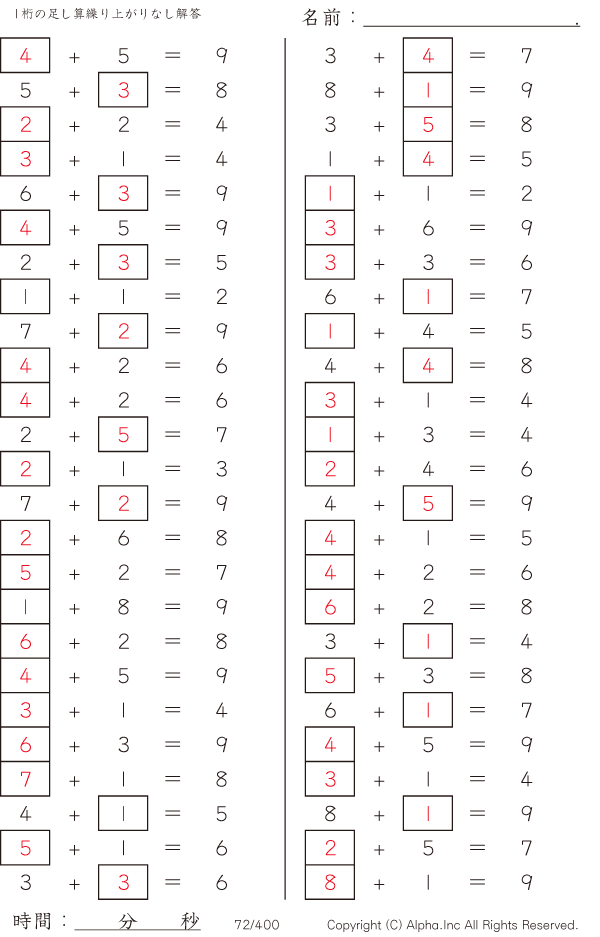 虫食い・1桁の足し算1(繰り上がりなし) [解答]072/400