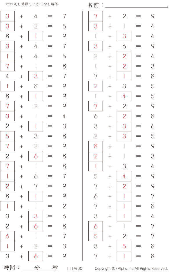 虫食い・1桁の足し算1(繰り上がりなし) [解答]111/400