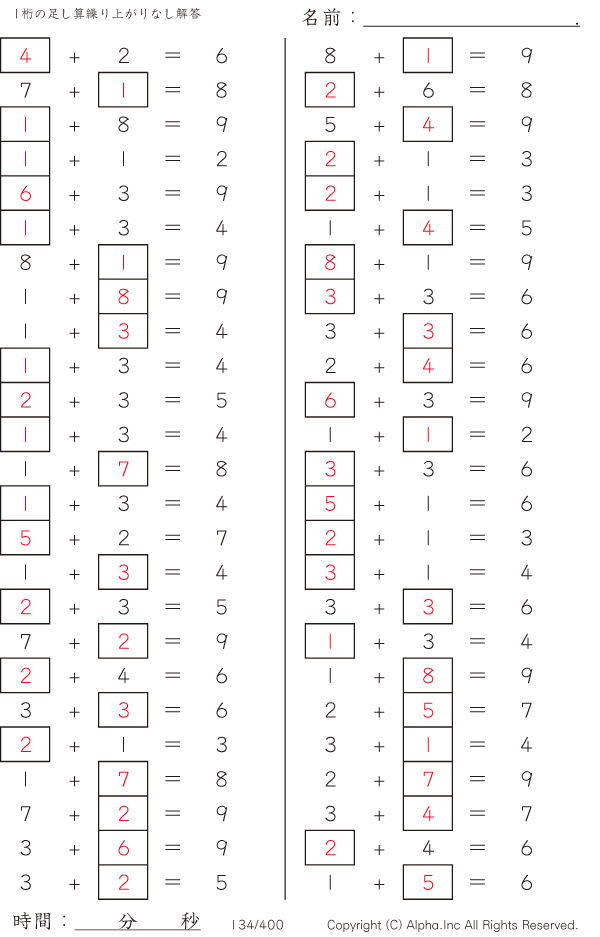 虫食い・1桁の足し算1(繰り上がりなし) [解答]134/400