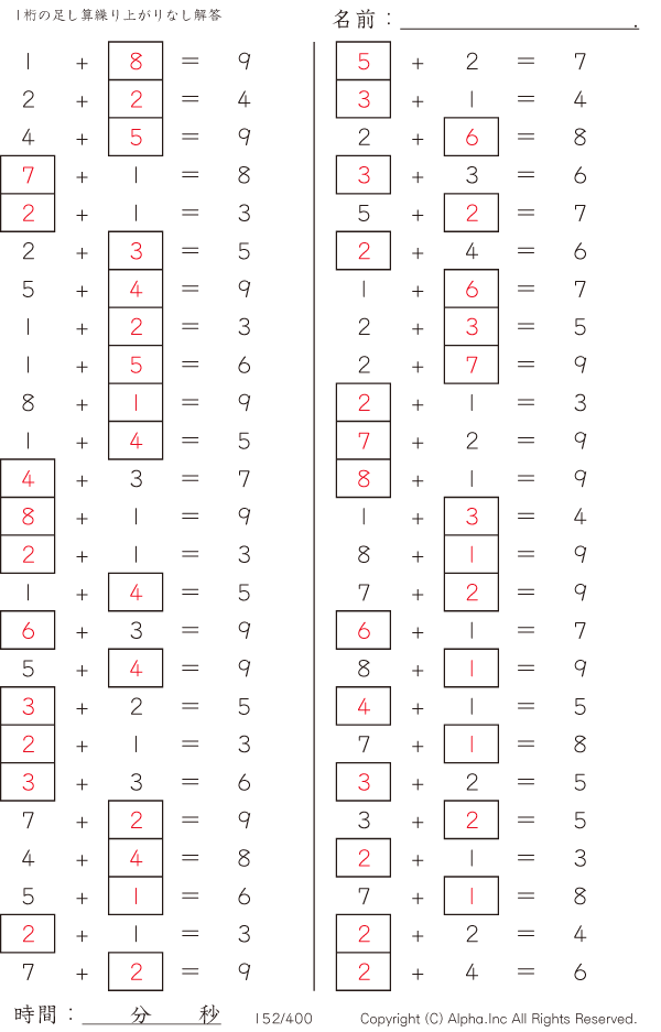 虫食い・1桁の足し算1(繰り上がりなし) [解答]152/400
