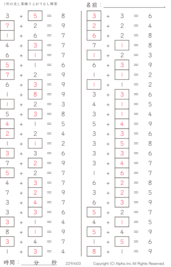 虫食い・1桁の足し算1(繰り上がりなし) [解答]229/400