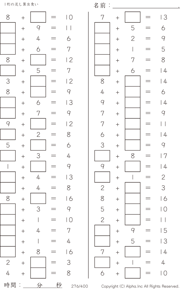 上記のボタンから「1桁の足し算2」の算数数学ドリル・計算ドリル(PDFプリント)がダウンロードできます。個人利用は無料です(家庭以外での配布は有料です)。