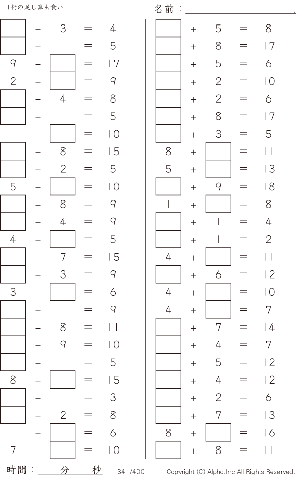 上記のボタンから「1桁の足し算2」の算数数学ドリル・計算ドリル(PDFプリント)がダウンロードできます。個人利用は無料です(家庭以外での配布は有料です)。