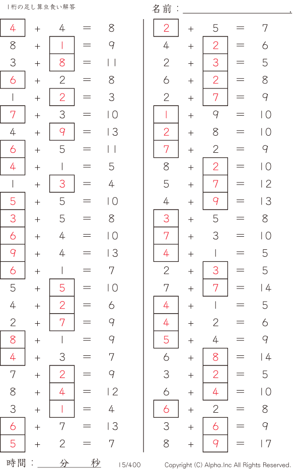 上記のボタンから「1桁の足し算2」の算数数学ドリル・計算ドリル(PDFプリント)がダウンロードできます。個人利用は無料です(家庭以外での配布は有料です)。