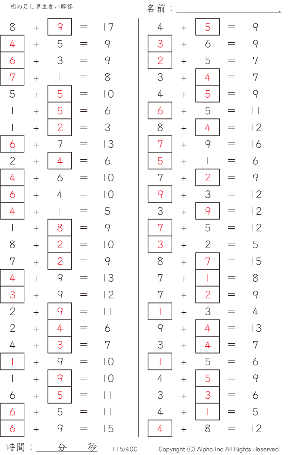 上記のボタンから「1桁の足し算2」の算数数学ドリル・計算ドリル(PDFプリント)がダウンロードできます。個人利用は無料です(家庭以外での配布は有料です)。