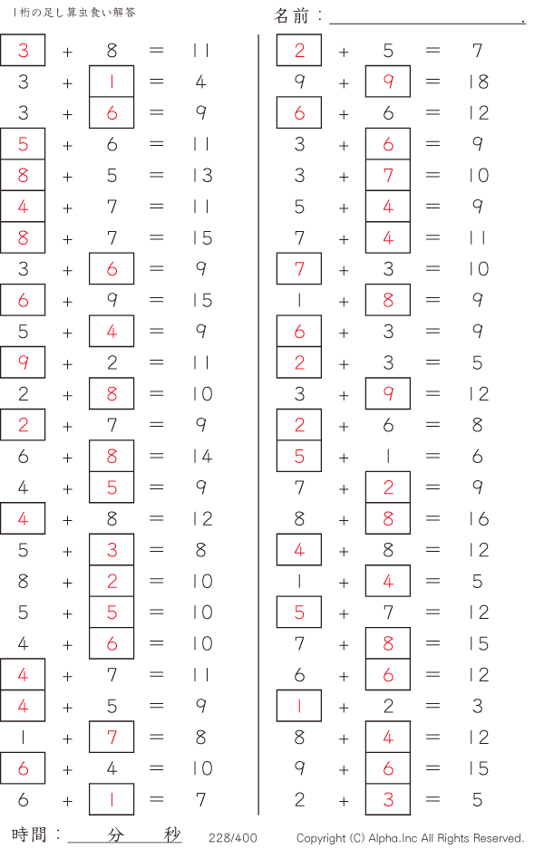 上記のボタンから「1桁の足し算2」の算数数学ドリル・計算ドリル(PDFプリント)がダウンロードできます。個人利用は無料です(家庭以外での配布は有料です)。