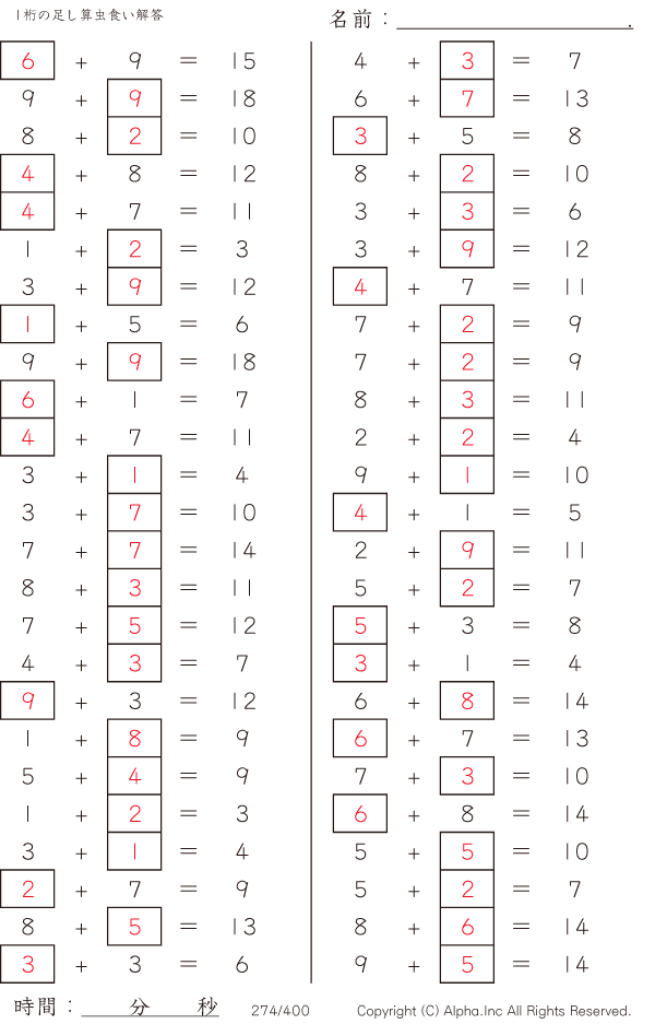 上記のボタンから「1桁の足し算2」の算数数学ドリル・計算ドリル(PDFプリント)がダウンロードできます。個人利用は無料です(家庭以外での配布は有料です)。