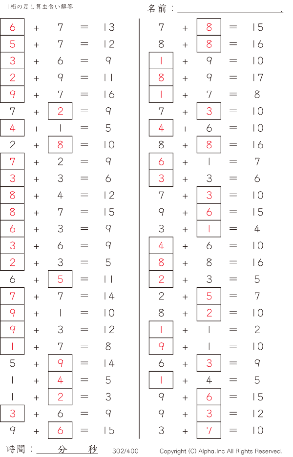 上記のボタンから「1桁の足し算2」の算数数学ドリル・計算ドリル(PDFプリント)がダウンロードできます。個人利用は無料です(家庭以外での配布は有料です)。