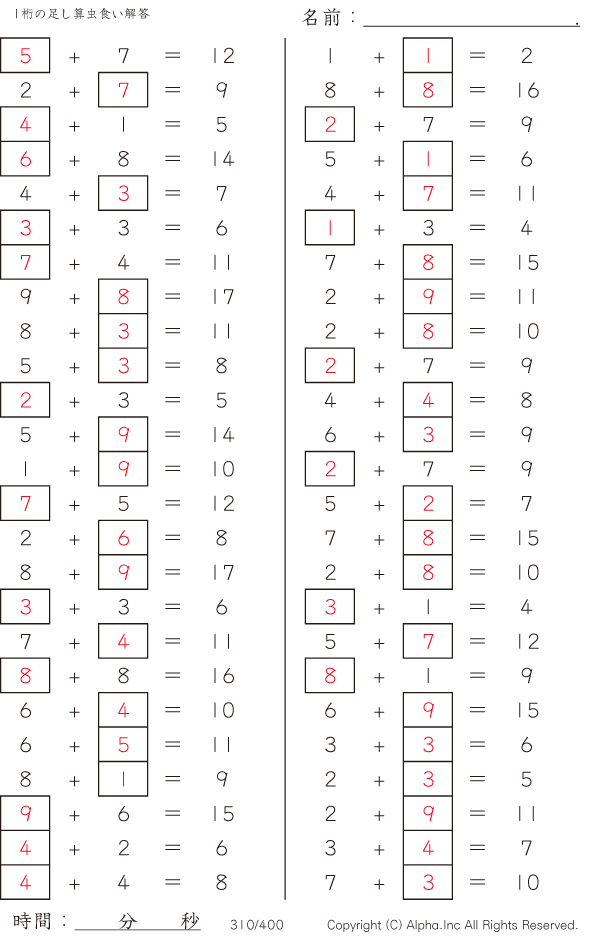 上記のボタンから「1桁の足し算2」の算数数学ドリル・計算ドリル(PDFプリント)がダウンロードできます。個人利用は無料です(家庭以外での配布は有料です)。