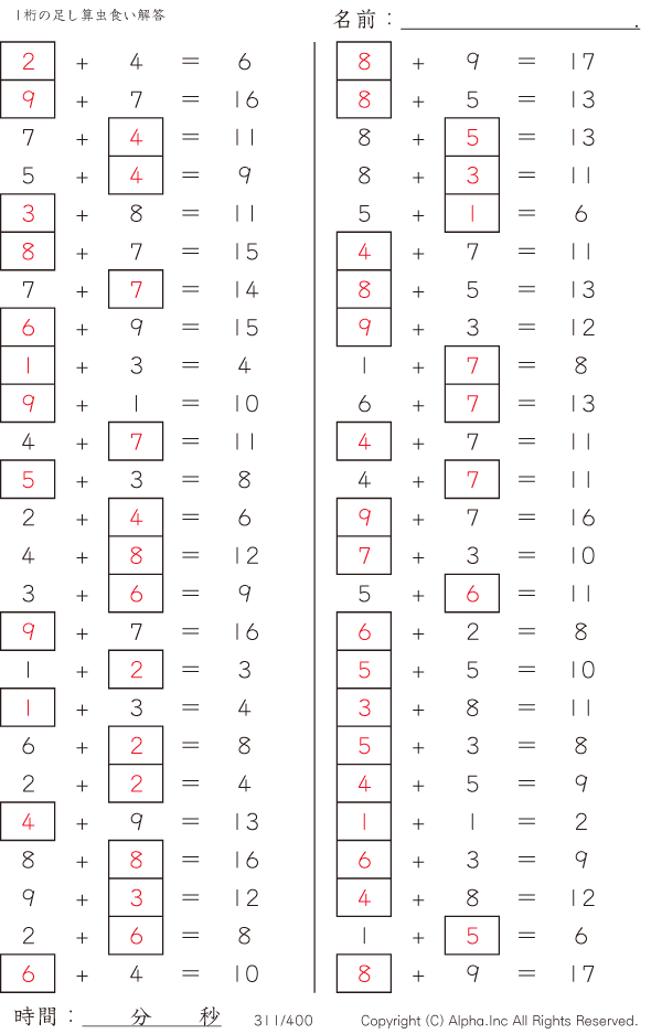 上記のボタンから「1桁の足し算2」の算数数学ドリル・計算ドリル(PDFプリント)がダウンロードできます。個人利用は無料です(家庭以外での配布は有料です)。