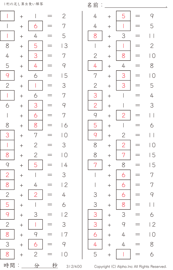 上記のボタンから「1桁の足し算2」の算数数学ドリル・計算ドリル(PDFプリント)がダウンロードできます。個人利用は無料です(家庭以外での配布は有料です)。