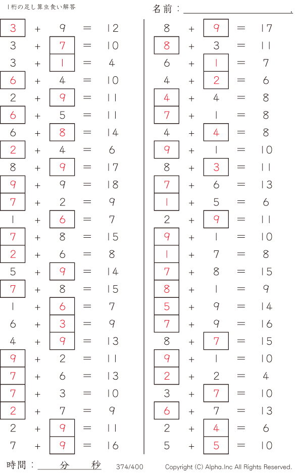 上記のボタンから「1桁の足し算2」の算数数学ドリル・計算ドリル(PDFプリント)がダウンロードできます。個人利用は無料です(家庭以外での配布は有料です)。