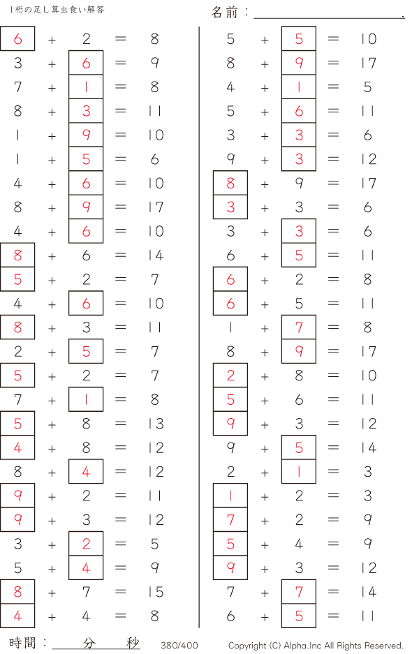 1桁の足し算2 [解答]380/400