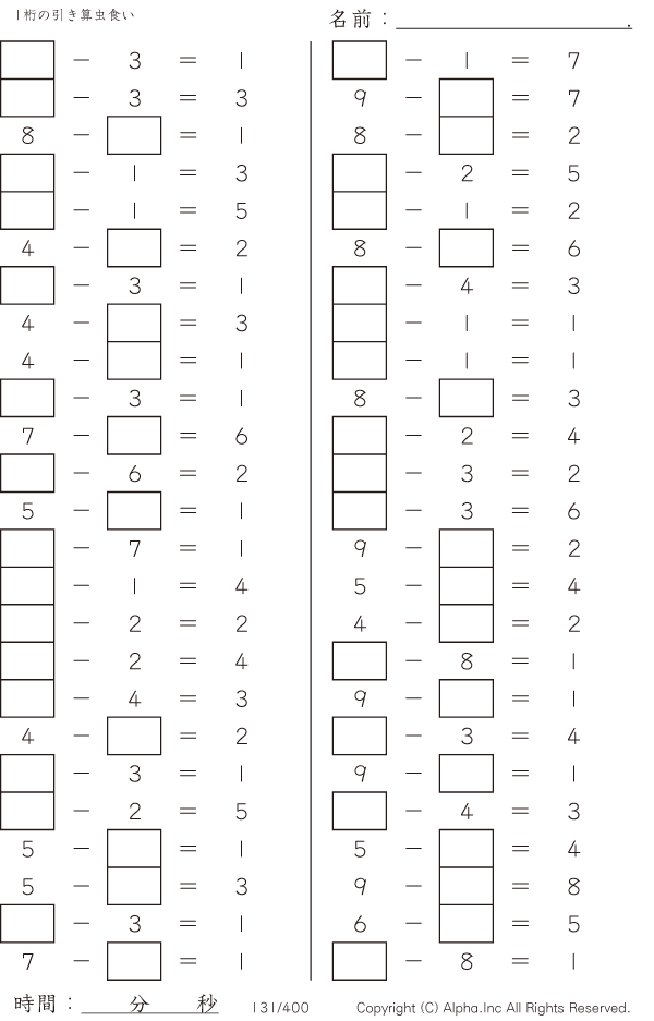 1桁の引き算1(繰り下がりなし) [問題]131/400