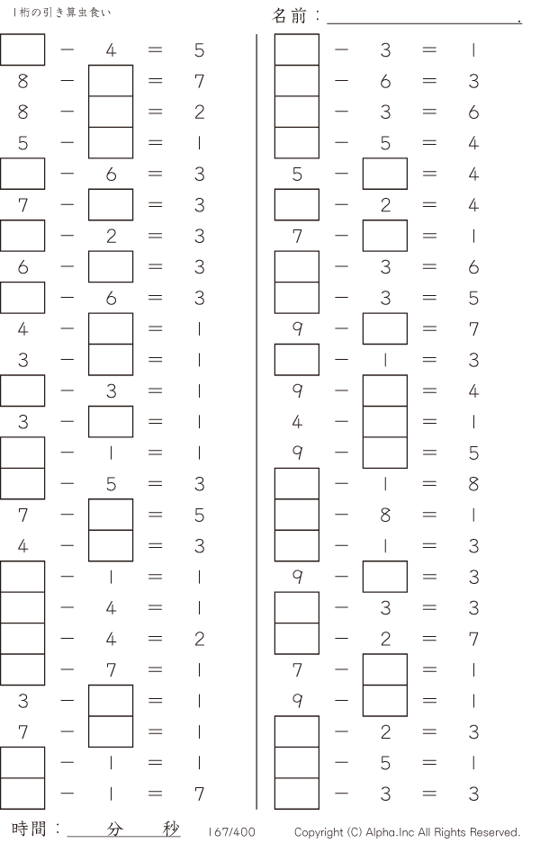 1桁の引き算1(繰り下がりなし) [問題]167/400