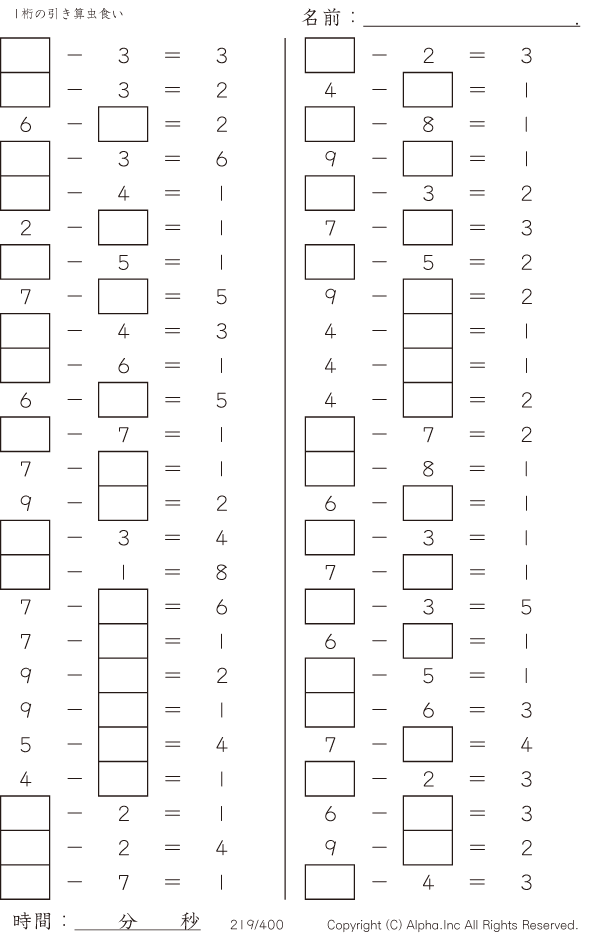 1桁の引き算1(繰り下がりなし) [問題]219/400