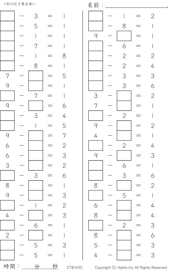 1桁の引き算1(繰り下がりなし) [問題]278/400