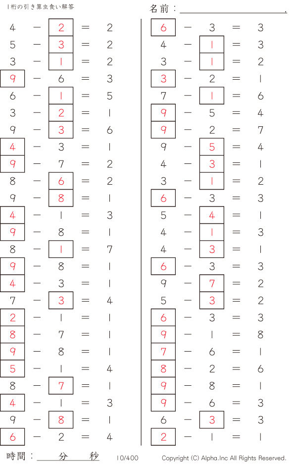 1桁の引き算1(繰り下がりなし) [解答]010/400