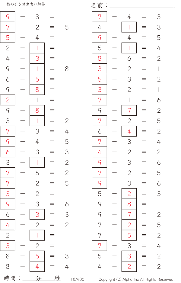 1桁の引き算1(繰り下がりなし) [解答]018/400
