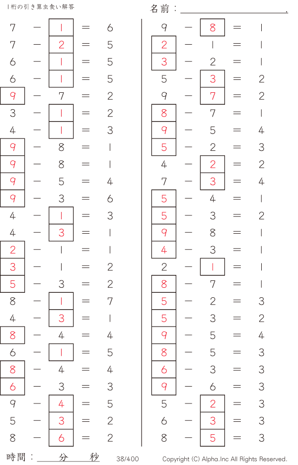 1桁の引き算1(繰り下がりなし) [解答]038/400