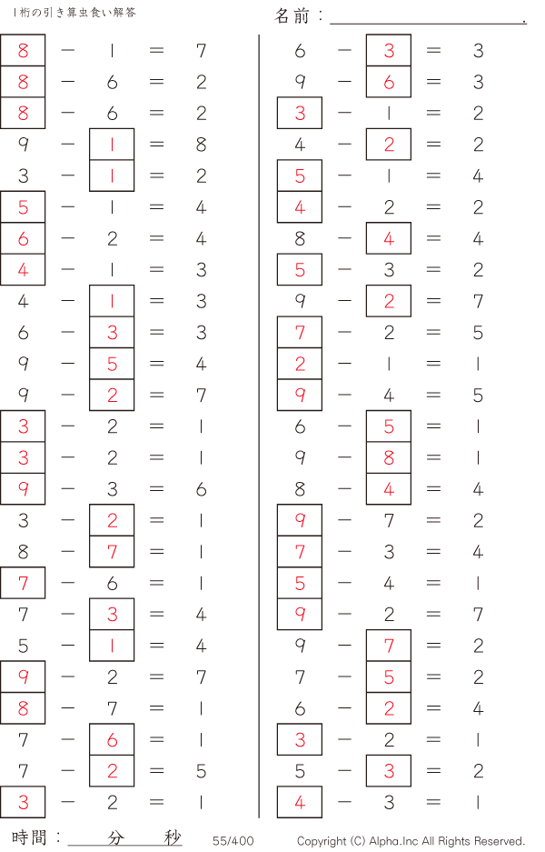 1桁の引き算1(繰り下がりなし) [解答]055/400