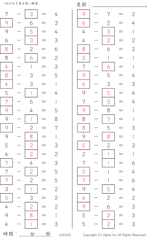1桁の引き算1(繰り下がりなし) [解答]063/400