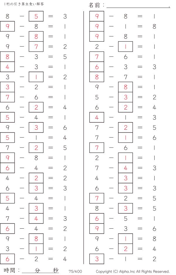 1桁の引き算1(繰り下がりなし) [解答]075/400