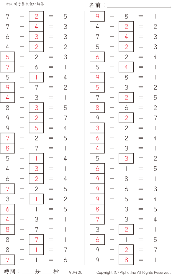 1桁の引き算1(繰り下がりなし) [解答]090/400