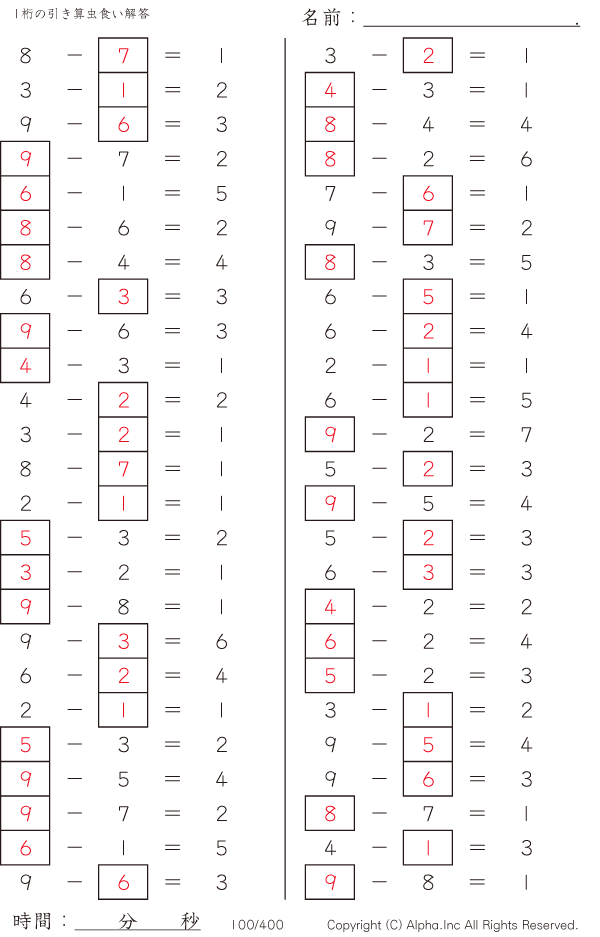 1桁の引き算1(繰り下がりなし) [解答]100/400
