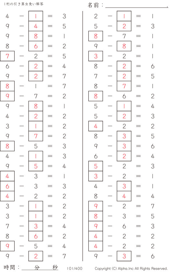 1桁の引き算1(繰り下がりなし) [解答]101/400