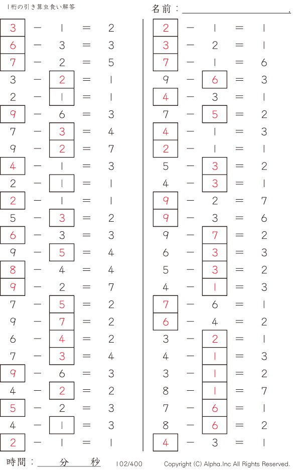 1桁の引き算1(繰り下がりなし) [解答]102/400