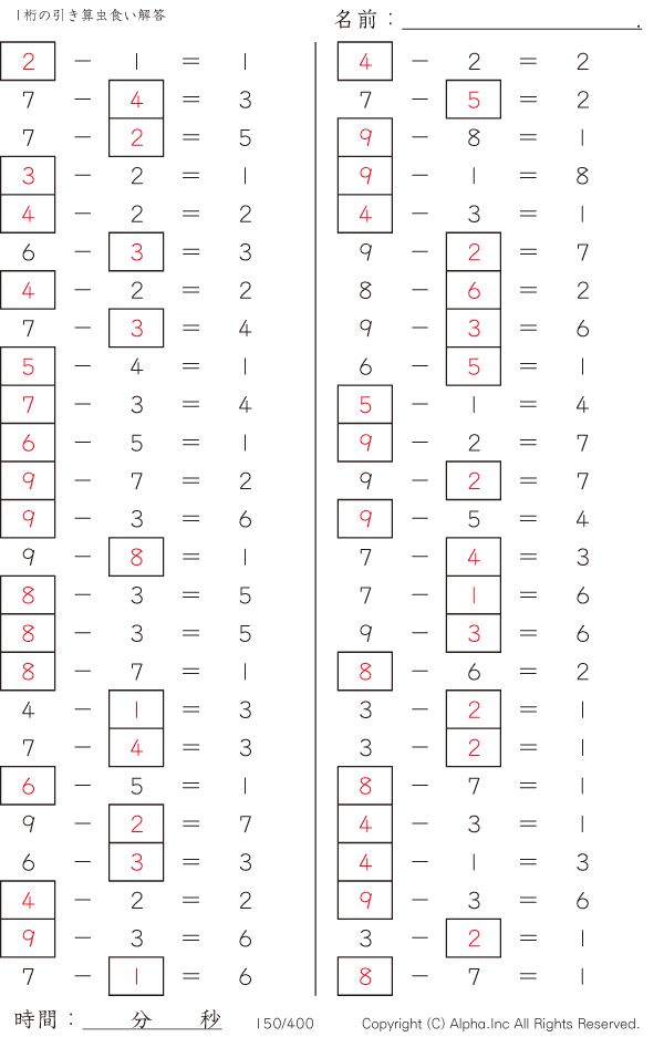 1桁の引き算1(繰り下がりなし) [解答]150/400