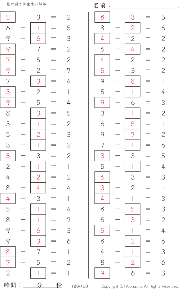 1桁の引き算1(繰り下がりなし) [解答]180/400