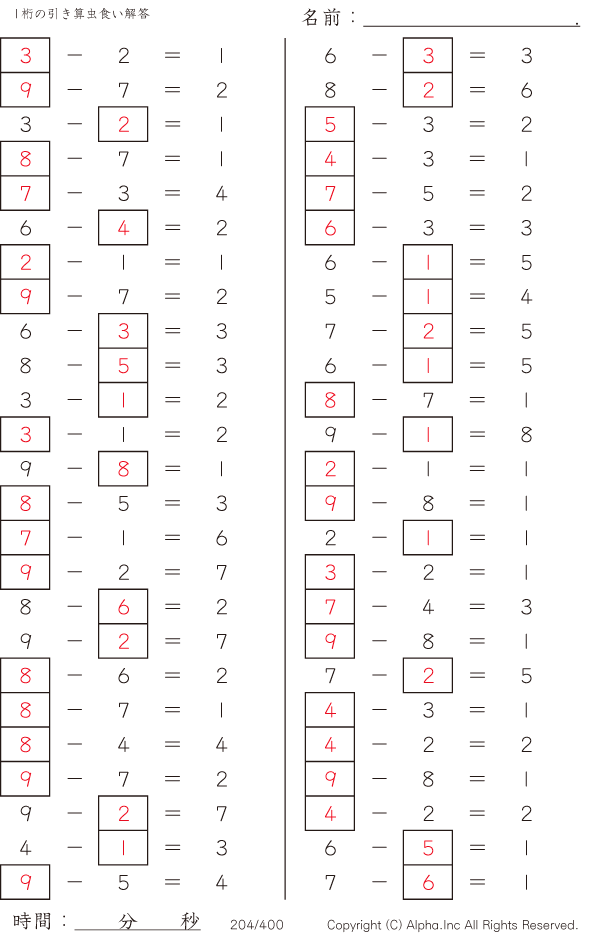 1桁の引き算1(繰り下がりなし) [解答]204/400