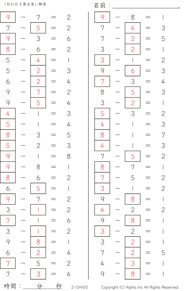 1桁の引き算1(繰り下がりなし) [解答]210/400