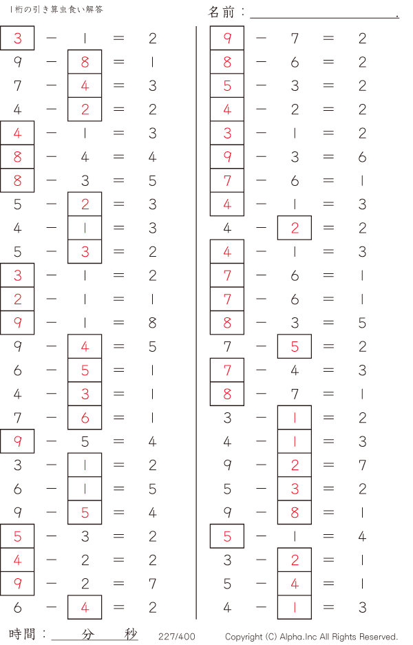 1桁の引き算1(繰り下がりなし) [解答]227/400