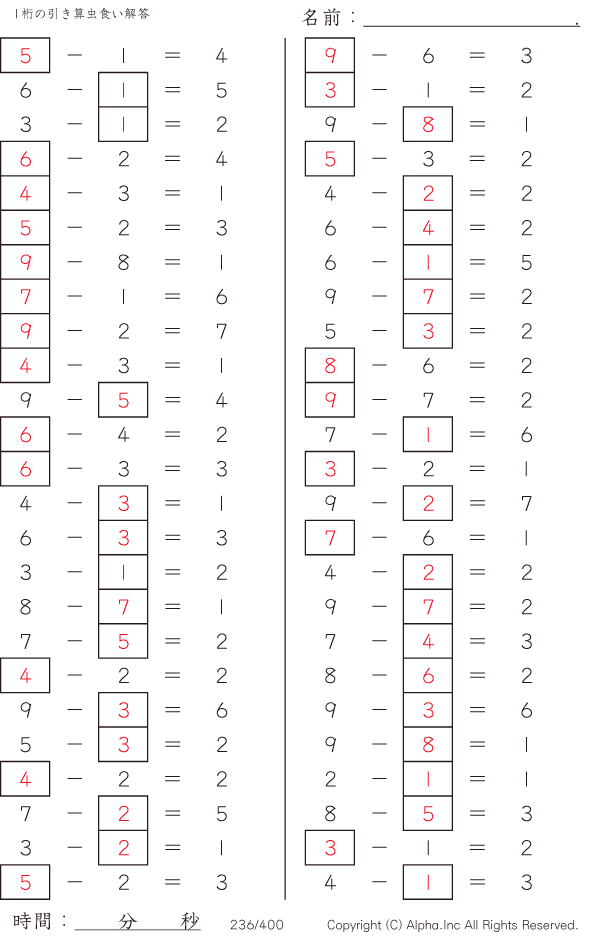 1桁の引き算1(繰り下がりなし) [解答]236/400