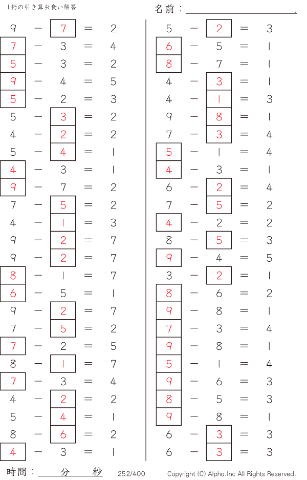 1桁の引き算1(繰り下がりなし) [解答]252/400