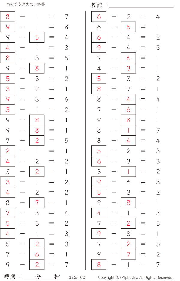 1桁の引き算1(繰り下がりなし) [解答]322/400