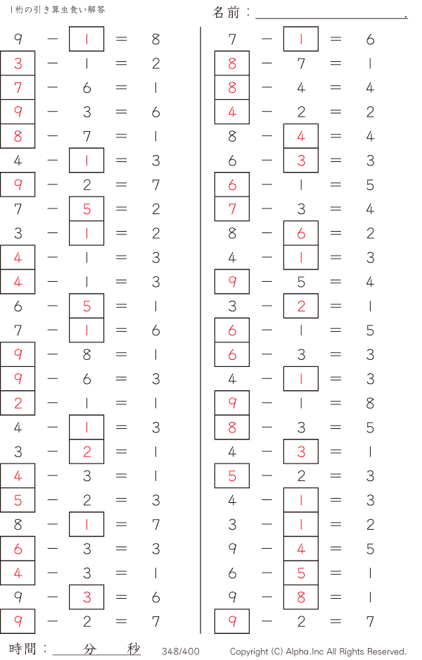 1桁の引き算1(繰り下がりなし) [解答]348/400