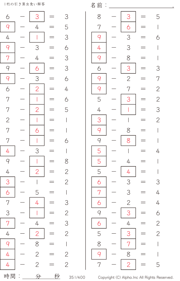 1桁の引き算1(繰り下がりなし) [解答]351/400