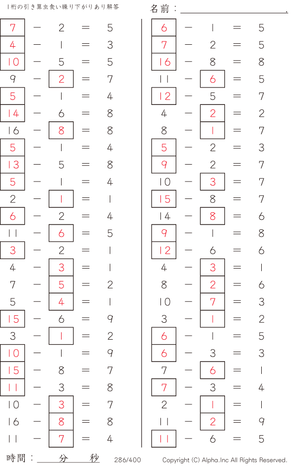 1桁の引き算2(繰り下がりあり) [解答]286/400