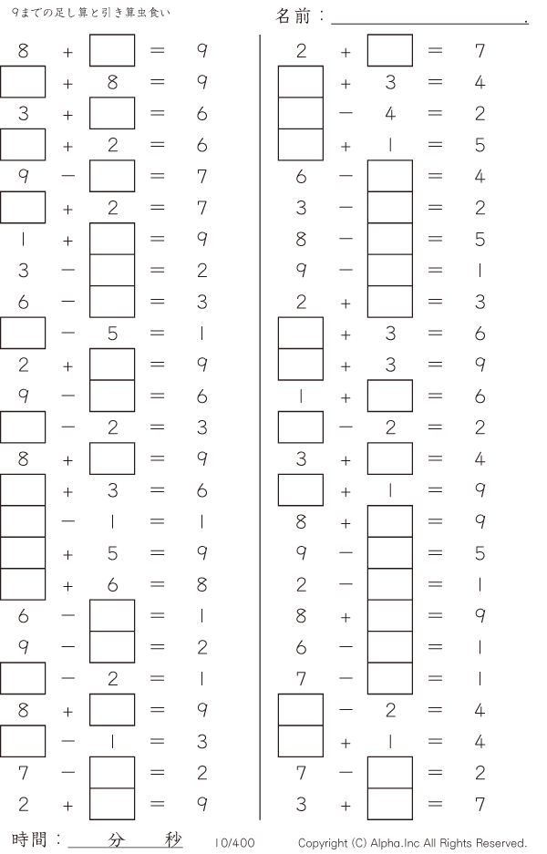 上記のボタンから「9までの足し算と引き算」の算数数学ドリル・計算ドリル(PDFプリント)がダウンロードできます。個人利用は無料です(家庭以外での配布は有料です)。