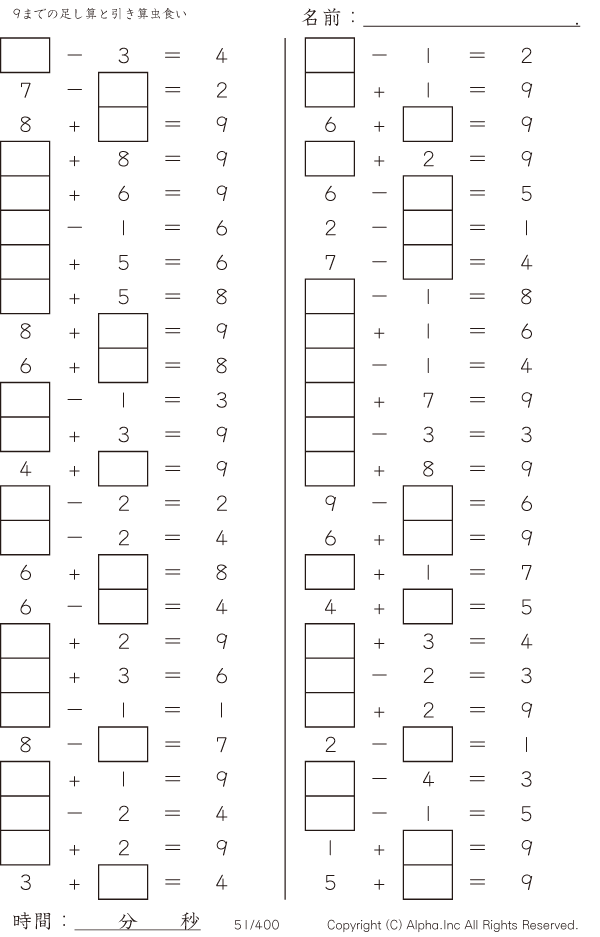 上記のボタンから「9までの足し算と引き算」の算数数学ドリル・計算ドリル(PDFプリント)がダウンロードできます。個人利用は無料です(家庭以外での配布は有料です)。