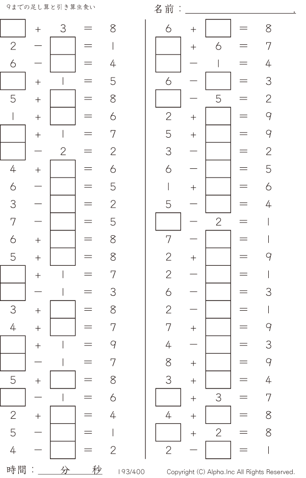 上記のボタンから「9までの足し算と引き算」の算数数学ドリル・計算ドリル(PDFプリント)がダウンロードできます。個人利用は無料です(家庭以外での配布は有料です)。