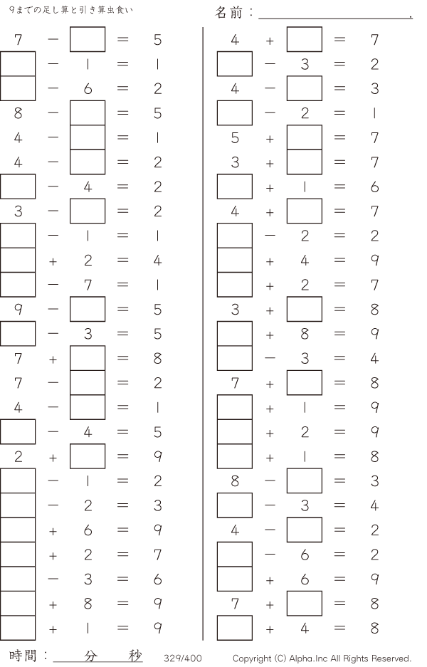 上記のボタンから「9までの足し算と引き算」の算数数学ドリル・計算ドリル(PDFプリント)がダウンロードできます。個人利用は無料です(家庭以外での配布は有料です)。