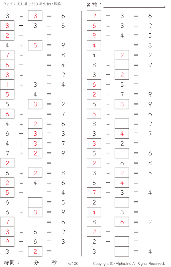 上記のボタンから「9までの足し算と引き算」の算数数学ドリル・計算ドリル(PDFプリント)がダウンロードできます。個人利用は無料です(家庭以外での配布は有料です)。