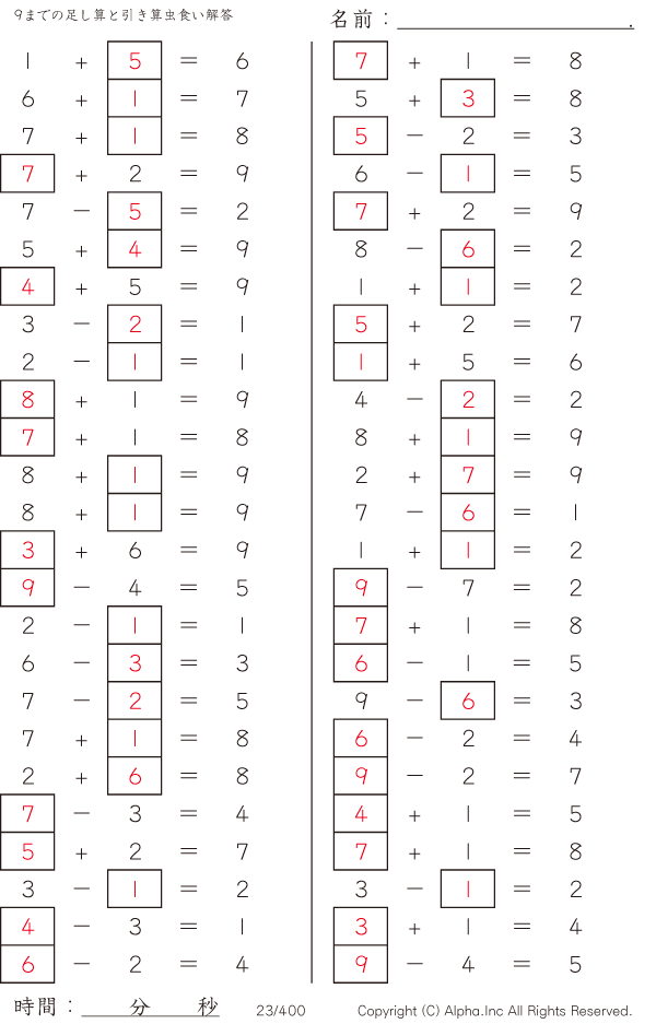 上記のボタンから「9までの足し算と引き算」の算数数学ドリル・計算ドリル(PDFプリント)がダウンロードできます。個人利用は無料です(家庭以外での配布は有料です)。