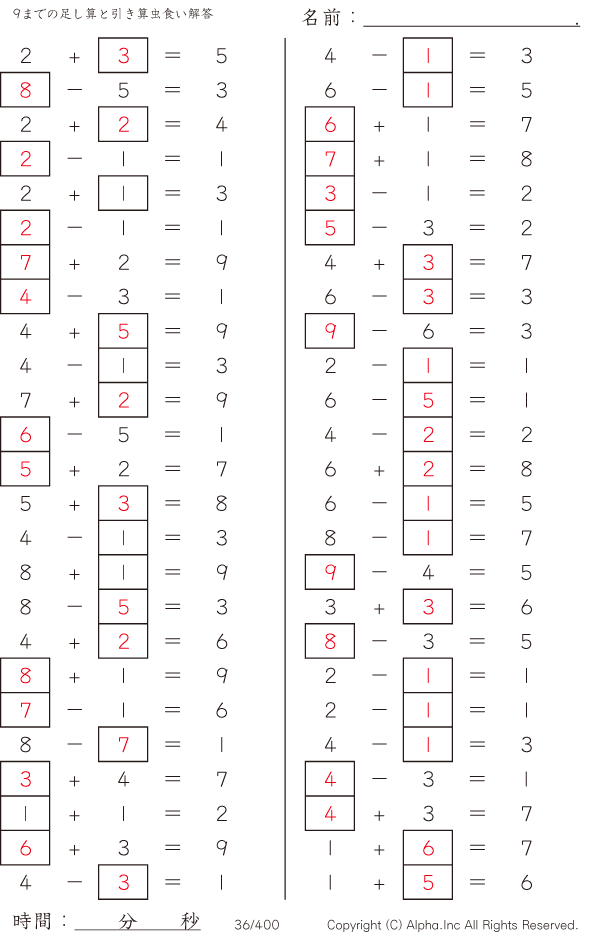 上記のボタンから「9までの足し算と引き算」の算数数学ドリル・計算ドリル(PDFプリント)がダウンロードできます。個人利用は無料です(家庭以外での配布は有料です)。