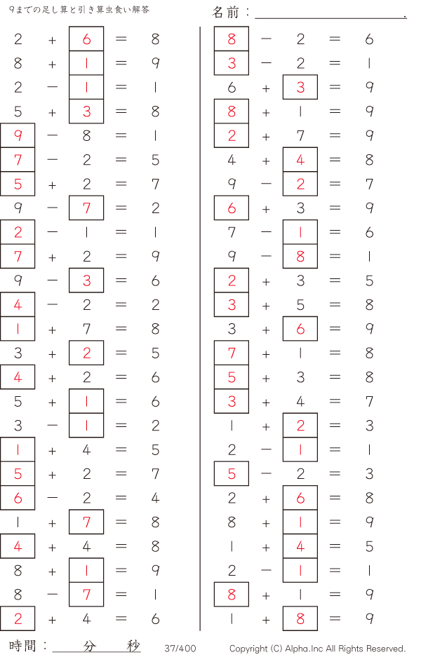 上記のボタンから「9までの足し算と引き算」の算数数学ドリル・計算ドリル(PDFプリント)がダウンロードできます。個人利用は無料です(家庭以外での配布は有料です)。